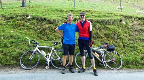 Now we headed up again as we turned north-west onto a narrow valley road, which winds gently up the Severn valley and headed into the Hafren Forest, a large expanse of upland forestation planted back in the 1930s and now a bit of a leisure playground with walking and mountain bike trails. The riding was pleasant, punctuated by the occasional steep pitch and we gradually climbed toward the 400m summit. Having found myself reminiscing yesterday about my youth hostelling cycling holiday some 45 years ago, today was a reprise of another leg of that trip and I recounted some of the adventure to Helen as we rode. By some rather bizarre and surreal coincidence reality was suspended when I stopped for the umpteenth time for a photo opportunity just as a group of 4 cyclists passed us, the last of whom came to an abrupt halt and shouted out my name much to my surprise. I turned to look and, after a double take, realised it was none other than Martin, my erstwhile best mate from school and one of the two lads I had ridden with all those years ago. What are the chances of that? Time to buy a lottery ticket I think. By now Helen and Martin's mates had ridden on round the next corner and we were left alone, standing at the side of the road unable to quite believe this was happening. We pedalled on now, slowly, catching up in more ways than one as we exchanged our tales of how come we happened to be here, now. After grabbing a photo of the two of us for old times sake we went our separate ways again, unable to quite comprehend what had just happened.